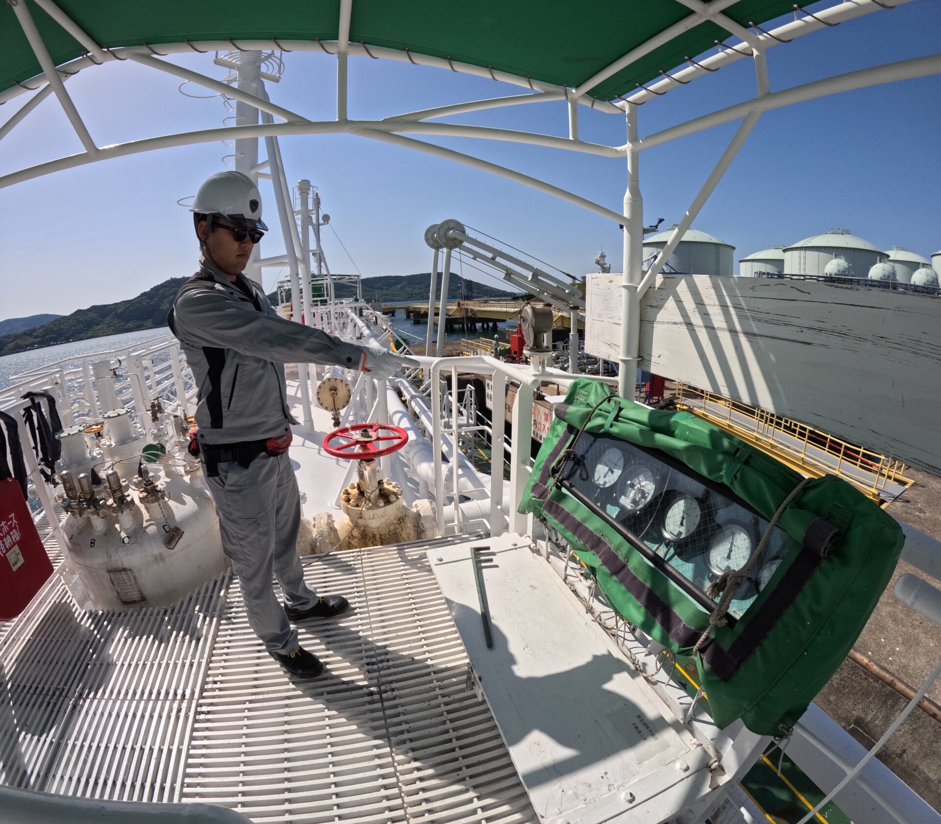 現場へ到着したら、内航船へLPG出荷作業を行います。